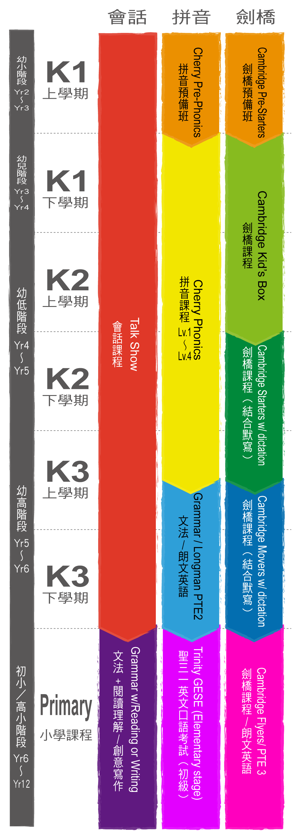 我們英語課程是針對每一個小朋友的成長階段需要而設計,因材施教。度身設計的組合教程、保證「NET」(Native Speaking Teacher) 教授和超小班教學是我們引領學生邁向成就的三大成功要素。成就學生校內英文程度保持全級top 20%。